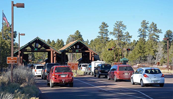 Cars line up to enter at the south entrance to the Grand Canyon in this 2018 file photo. Service at the park have been cut in response to the coronavirus, but the park remains open and the Interior Department this week waived entrance fees to all national parks. (Photo courtesy Grand Canyon National Park)