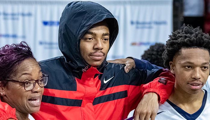 Desert Vista sophomore guard Dasean Lecque, right, celebrates with his older brother, Phoenix Suns rookie Jalen Lecque, and their mother, Michelle Lecque, after Desert Vista won the 6A boys state championship in Desert Financial Arena. (Photo by Nathan Hiatt/Cronkite)