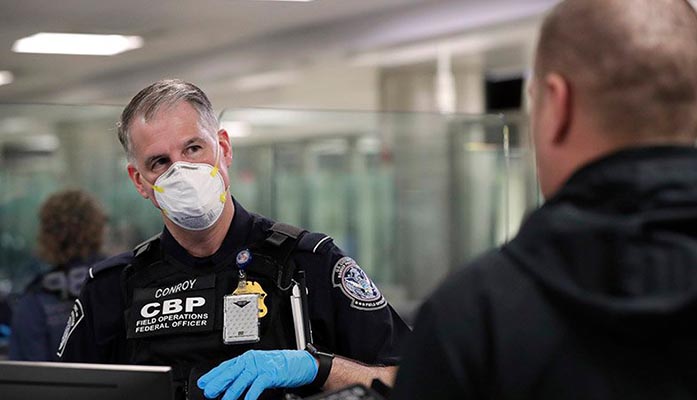 A Customs and Border Protection officer talks with an international traveler this week at Dulles International Airport in Northern Virginia. CBP officers have recently started wearing personal protective equipment, like masks and gloves, in response to the coronavirus. (Photo by Glenn Fawcett/U.S. Customs and Border Protection)