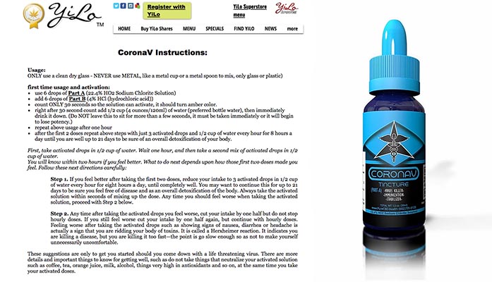 coronavirus YiLo also maintained a webpage giving consumers instructions on how to use this “Coronav Tincture” if consumers “come down with a life threatening virus.”