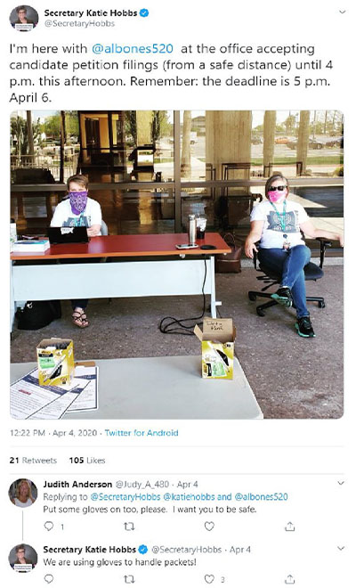 While Hobbs claims the pandemic has interfered with the initiatives’ ability to gather signatures, on Monday, Arizona State House candidate Kathy Pearce filed her nominating signatures after entering the race just ten days ago. “I can’t tell you how much everyone’s help means to me,” said Pearce in a Facebook post. “We got in about nine or ten days ago and by last night, when we added up all of the signatures we had received or collected we were looking at around 750 signatures… In a little over eight full days of collecting.”