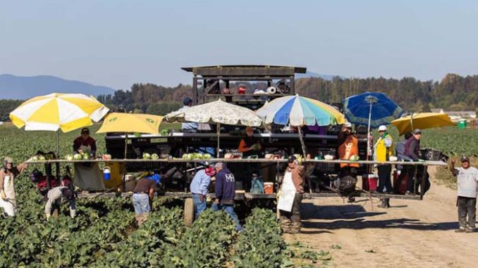 Migrant workers harvest cauliflower in Washington. A new survey of 100 migrants workers in the U.S. on H-2A visas says that conditions for those workers – which were never good – have been made worse by COVID-19. (Photo by Andrew A. Reding/Creative Commons)