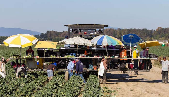 Migrant workers harvest cauliflower in Washington. A new survey of 100 migrants workers in the U.S. on H-2A visas says that conditions for those workers – which were never good – have been made worse by COVID-19. (Photo by Andrew A. Reding/Creative Commons)