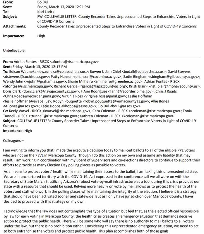 PHOENIX – Secretary of State’s Elections Director Bo Dul called Maricopa County Recorder Adrian Fontes’ decision to illegally send ballots to voters who did not request them “unbelievable.” Secretary of State Katie Hobbs then officially blasted Fontes for overstepping his legal authority.