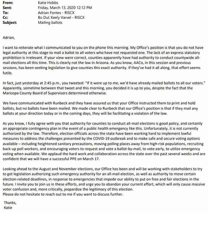 “In fact, just yesterday at 2:45 p.m., you tweeted: ‘If it were up to me, we’d have already mailed ballots to all our voters.’ Apparently, sometime between that tweet and this morning, you decided it is up to you , despite the fact that the Maricopa County Board of Supervisors determined otherwise.”