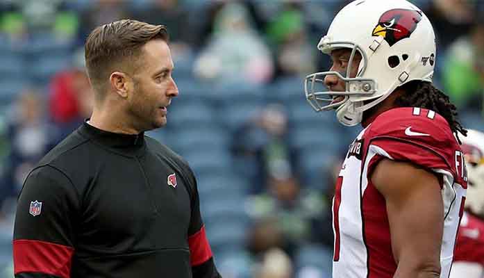 Arizona Cardinals coach Kliff Kingsbury (left), talking here with wide receiver Larry Fitzgerald, said he hopes discussions about race and George Floyd’s death can continue throughout the season. (Photo by Abbie Parr)