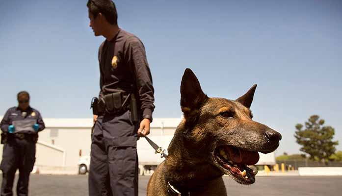 A Customs and Border Protection officer and his canine at the Otay Mesa, Calif., port of entry in a 2016 file photo. A new audit of Customs and Border Protection says the agency took money intended for medical and migrant care facilities and instead spent it improprely on ATVs, canine units and more. (Photo by Glenn Fawcett/U.S. Customs and Border Protection)