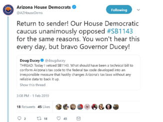 Arizona Daily Independent headlines Governor Ducey denies Trump tax cuts, vetoes Conformity Bill February 1, 2019 Arizona Daily Independent News Service